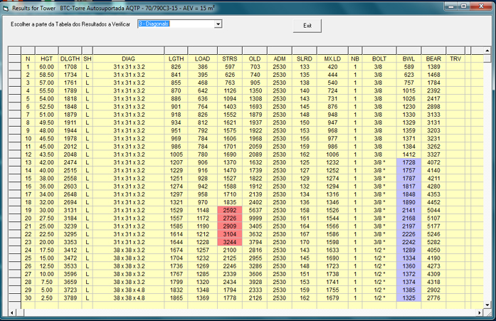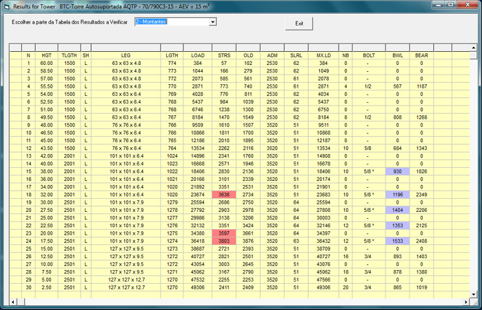 - Os resultados obtidos são confiáveis. O programa já está comprovado. - Dezenas de milhares de torres de todos os tipos foram dimensionadas, verificadas, aprovadas, instaladas e ainda em uso . - Resultados de verificação claros e de fácil interpretação como se vê nos exemplos abaixo:.
