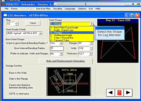 In this example, the choice for the section for a leg member of the structure is done through a drop-down menu which only contains sections that can be used in this context.